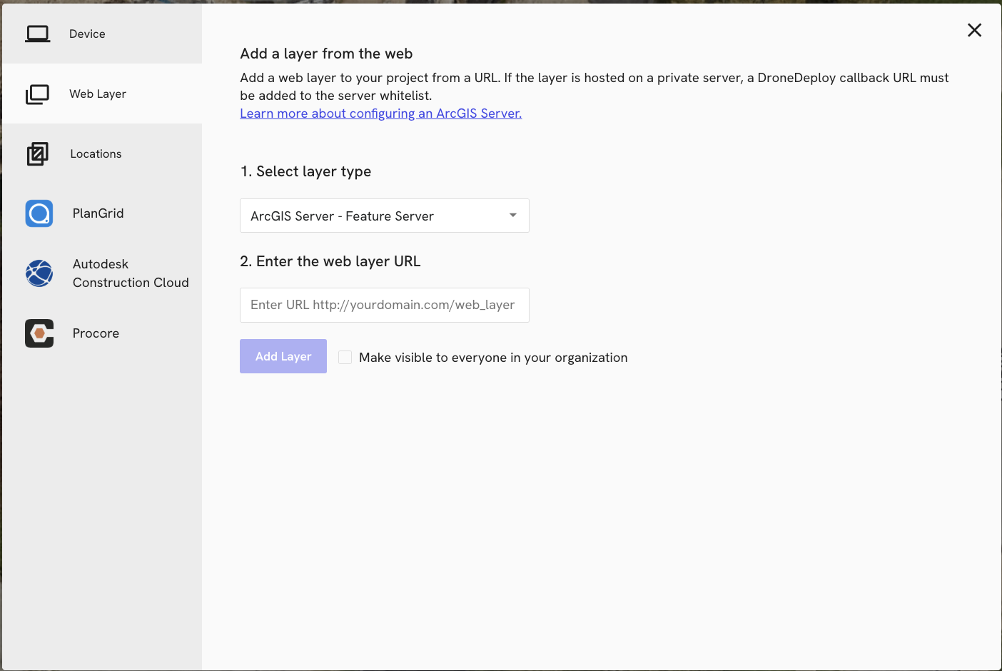 Web layer overlays allow you to add custom web layers from a tile layer URL directly onto your DroneDeploy maps. This feature enables you to visualize drone data alongside geospatial data from other sources—such as ArcGIS Feature Servers, Map Servers, or Tile Template URLs (XYZ)—to get the full context of your geographical information.
