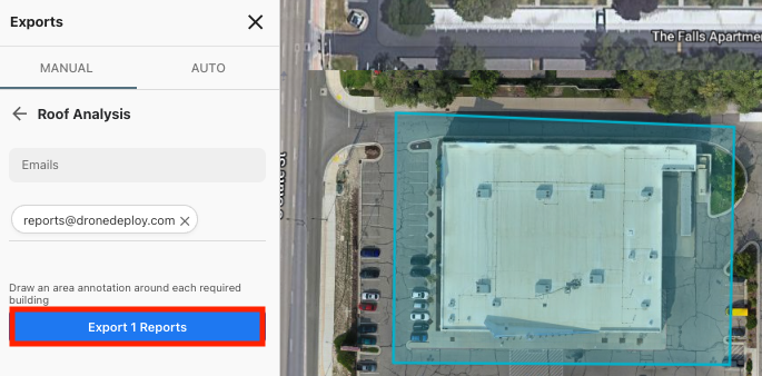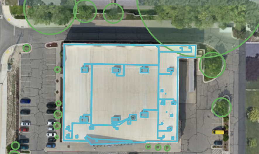 Multi-Building Support: Mark multiple individual buildings on a single map using separate area annotations. Each building receives a unique roof report.