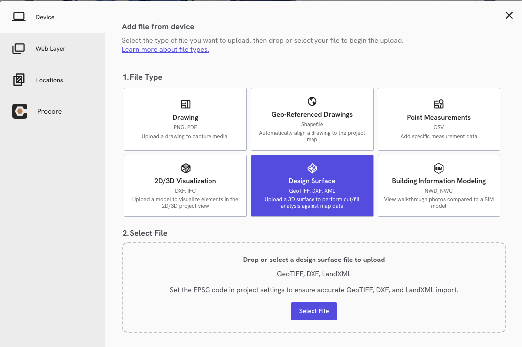 A design surface represents the target topography for a construction site. By uploading a design file, you can compare your current drone maps against these targets to perform a cut-fill analysis. This allows you to quantify how much material has been moved or how much is required to reach the final grade