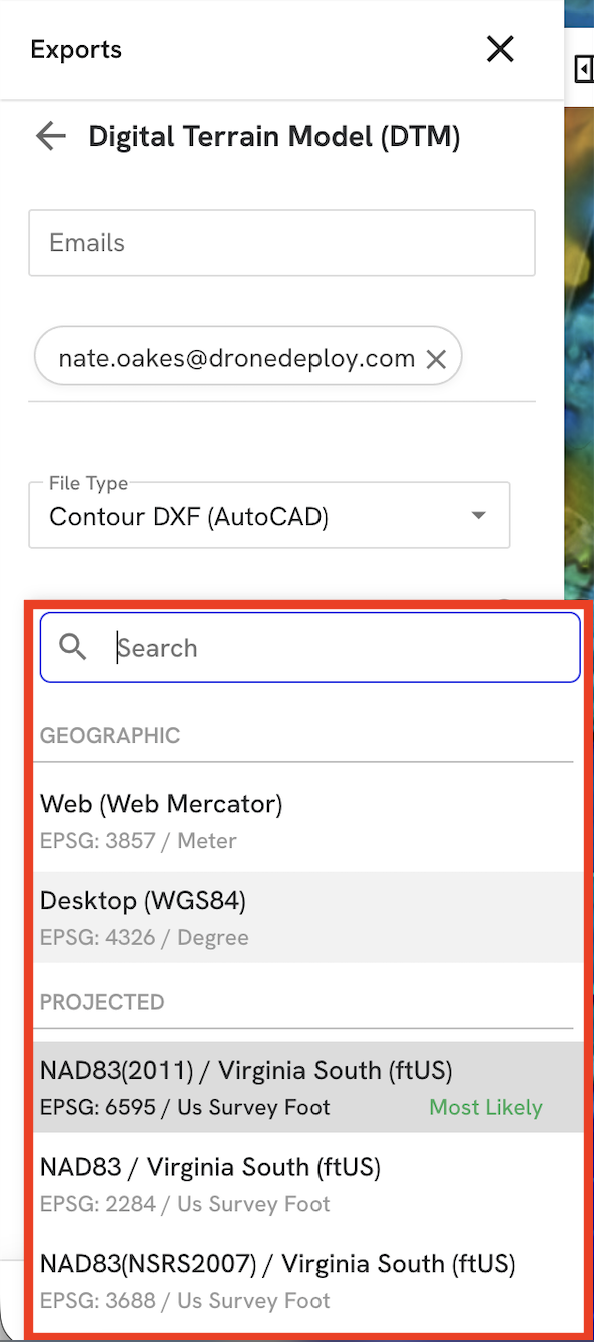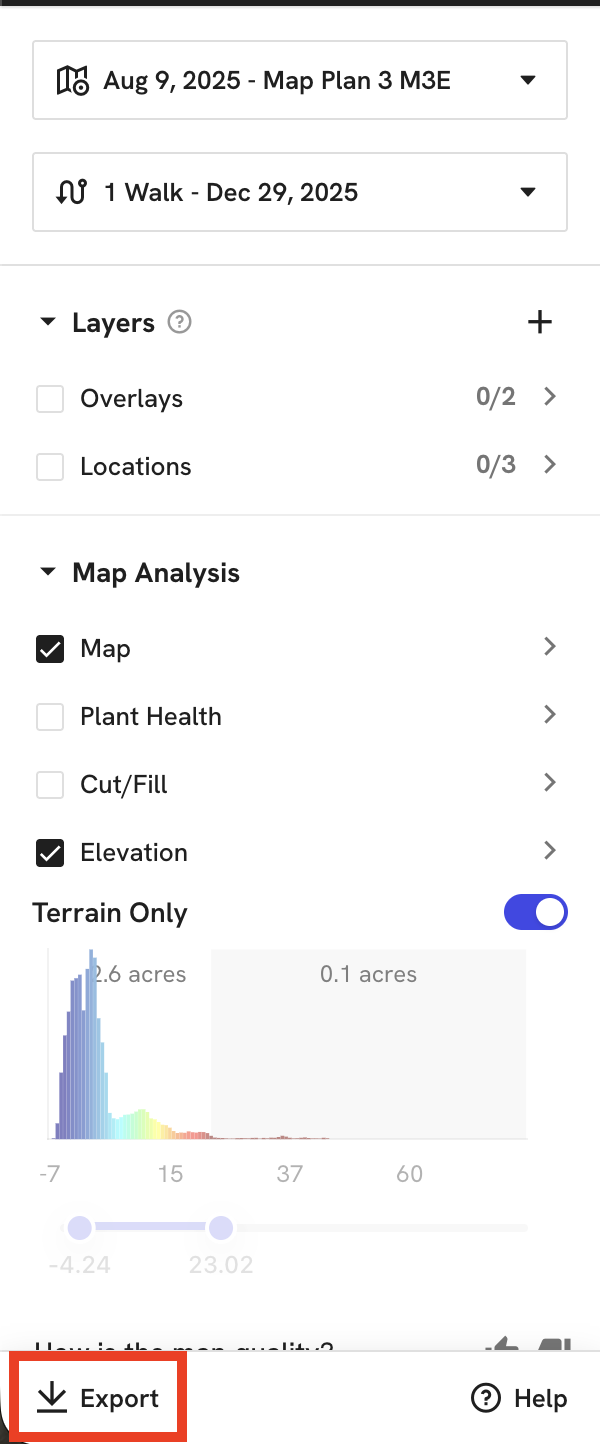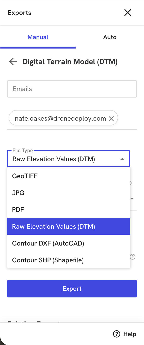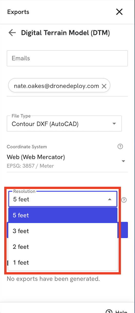 Click Export. DroneDeploy sends an email notification when the download is ready. To ensure receipt, allow emails from exports@dronedeploy.com.