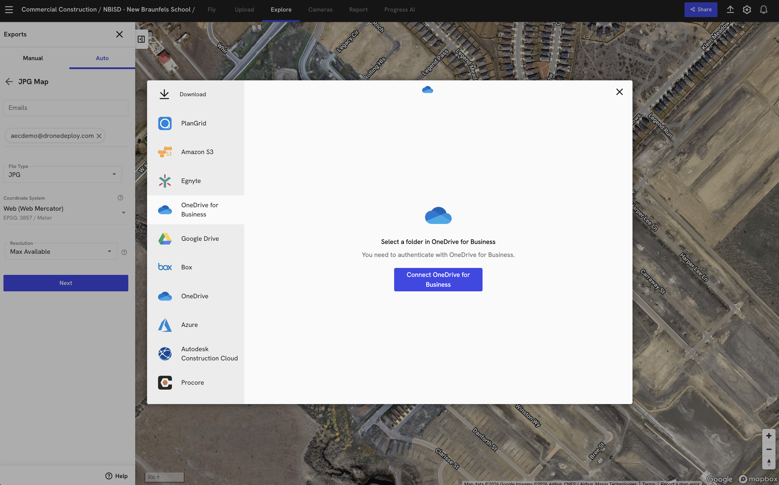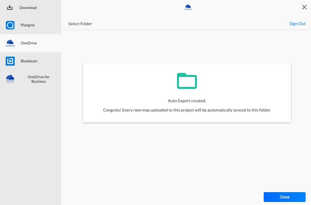 The OneDrive integration allows for Auto Exports, saving your team from manually requesting and downloading standard exports after a map completes processing. Each time a new map processes in a configured project, the data triggers an automatic sync to your chosen OneDrive destination.