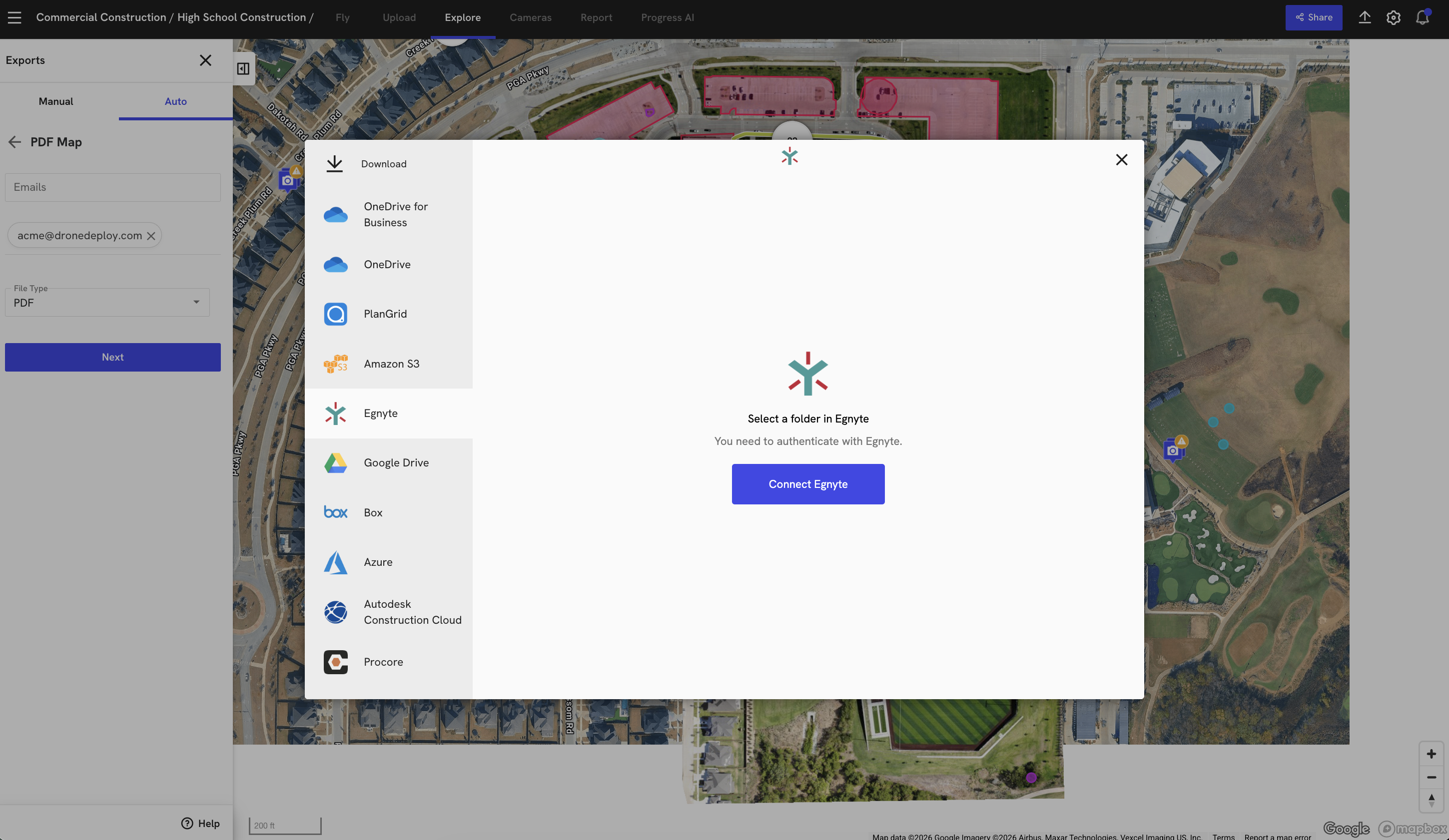 DroneDeploy allows you to automatically sync your map exports directly to Egnyte. By configuring an Auto Export, your team can access actionable data in your preferred storage solution as soon as a map completes processing.