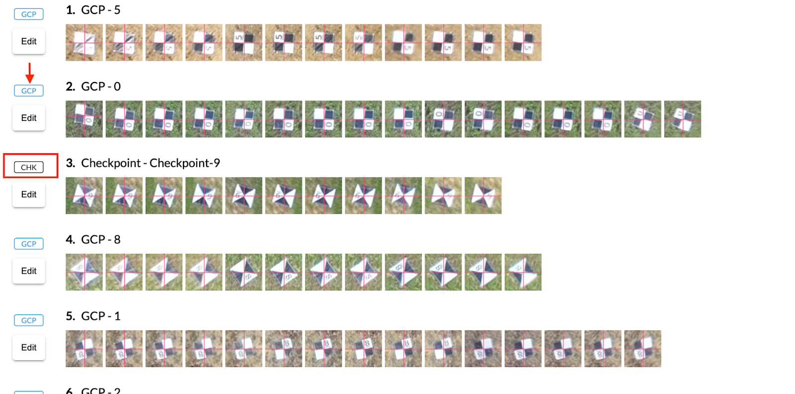 When you review your GCPs you will see the summary displayed below. On this page you will be able  to click “Edit” and manually fine tune the position of the cross-hairs to the center of the marker IF needed. Also, you can click on the blue GCP label window (as shown in the red arrow), and that will change that point from GCP to Checkpoint or vice-versa.