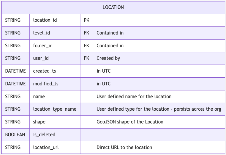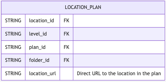 Allows users to connect data in locations across DroneDeploy maps/plans. Much like Levels, Locations persist across all maps/plans in a Project. Because of that, there is a many-to-many relationship between Plan <> Location. This table is provided for convenience to bridge the two together.