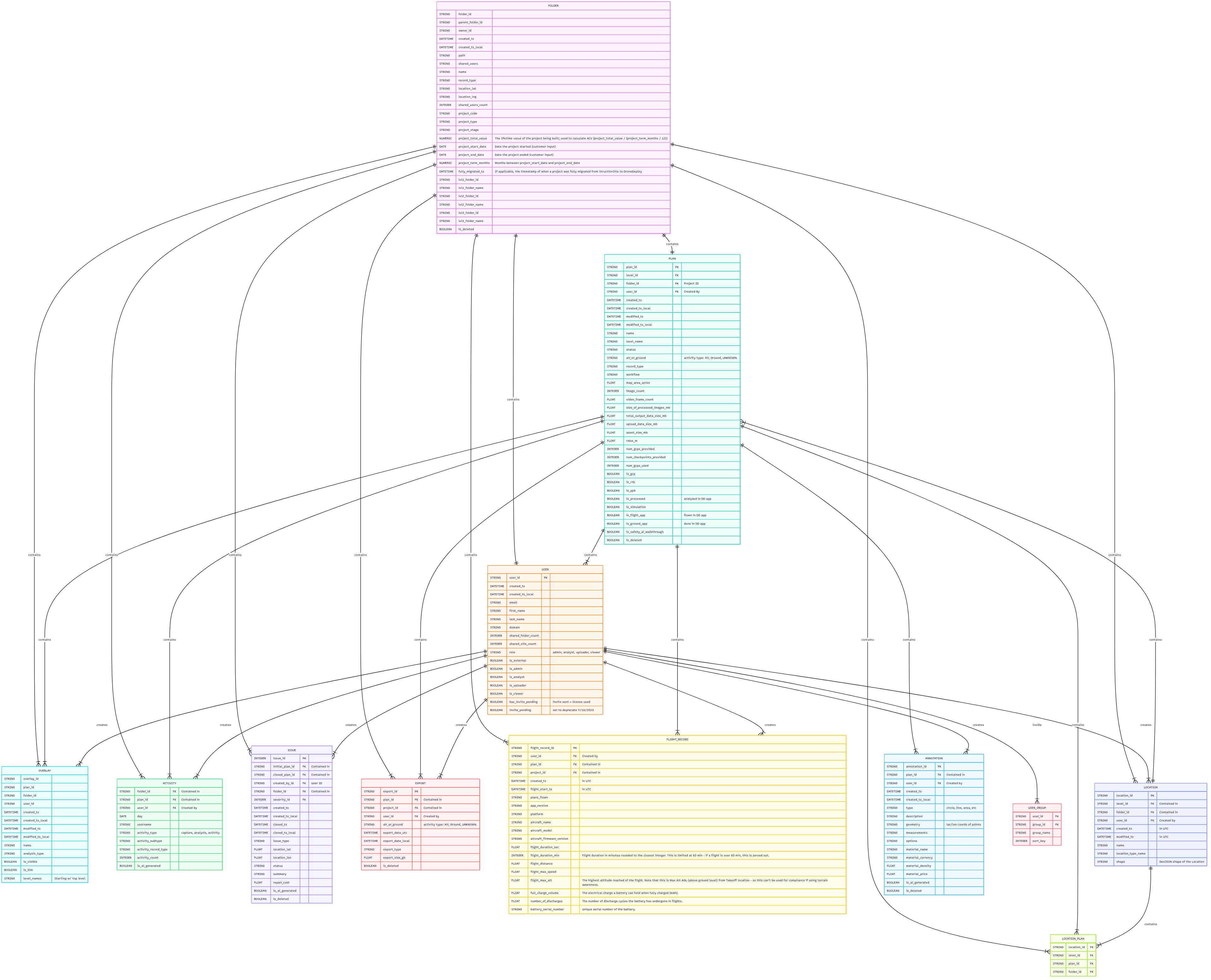 The DroneDeploy data instance includes several tables that can be used to analyze your usage on the platform. The entire customer model can be seen below.