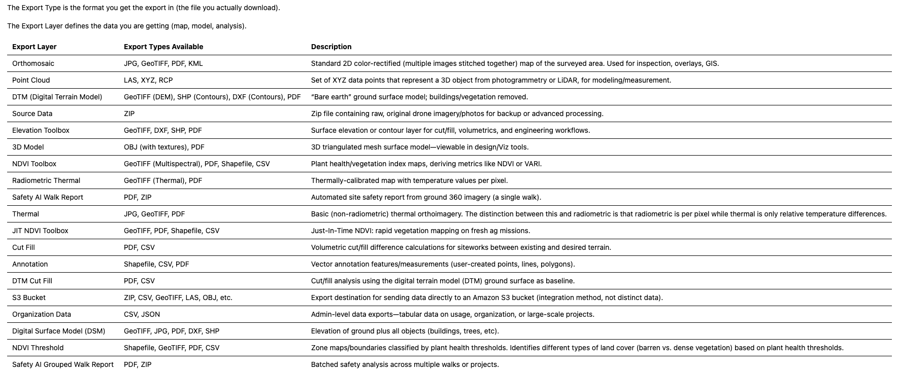 Record of all files and their formats sent using the Export function within the DroneDeploy application. This includes auto-exports.