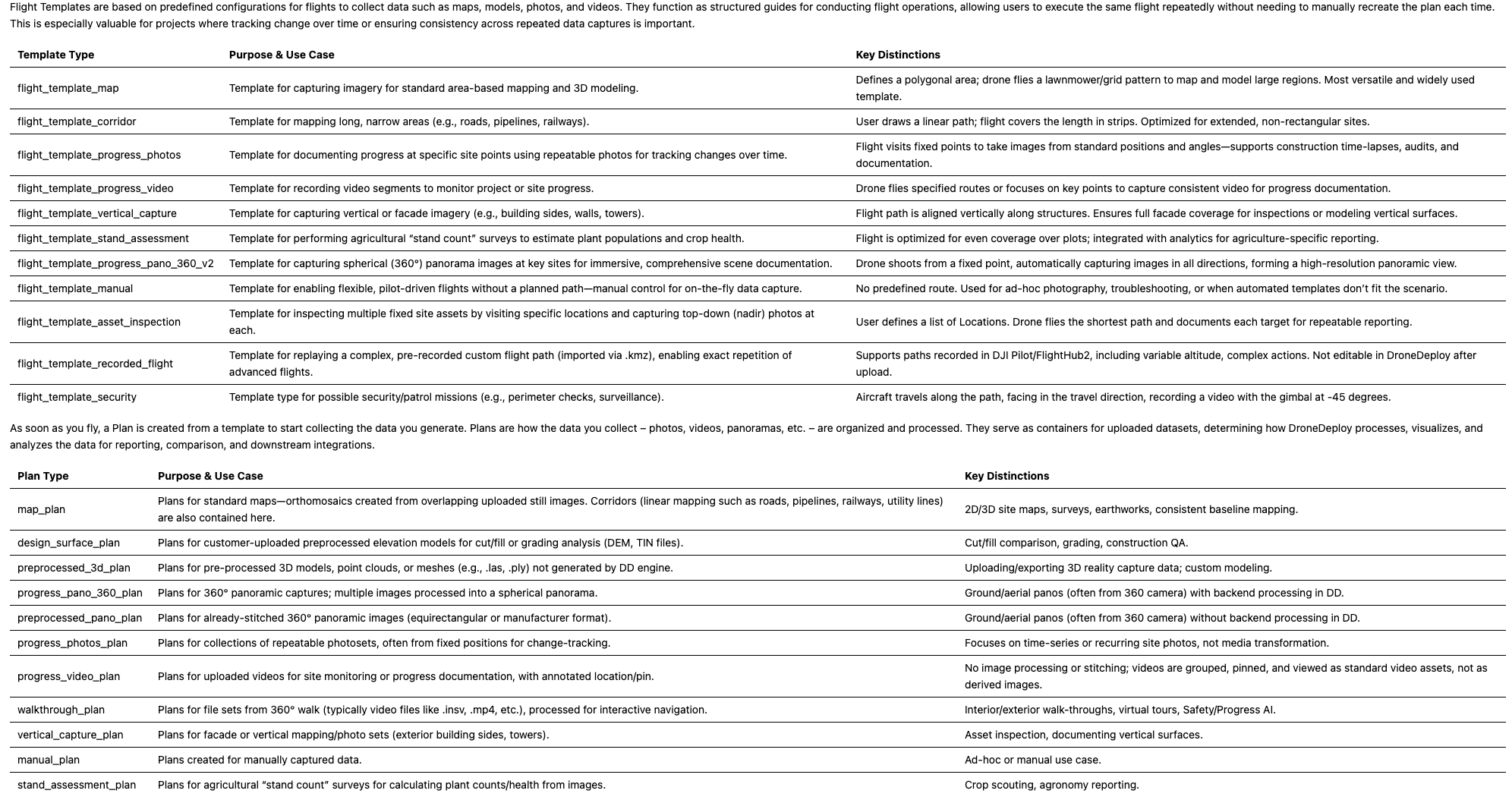 The Plan object originated as a Flight Plan (a set of commands, such as a drone flight path, given by the pilot to capture a map area), but has become the core object that holds the drone/robot path, and also the resulting data (map, 3D model, walkthrough, panorama etc.) that resulted from the execution of that plan. This is true even if one uploads data to our MapEngine via the UI or API without specifying or executing a Flight Plan using DroneDeploy.