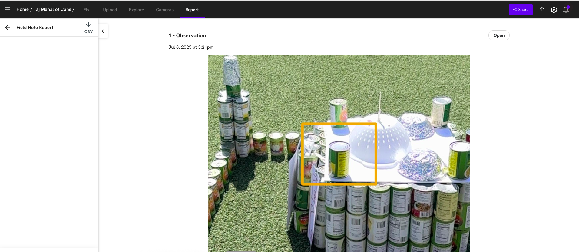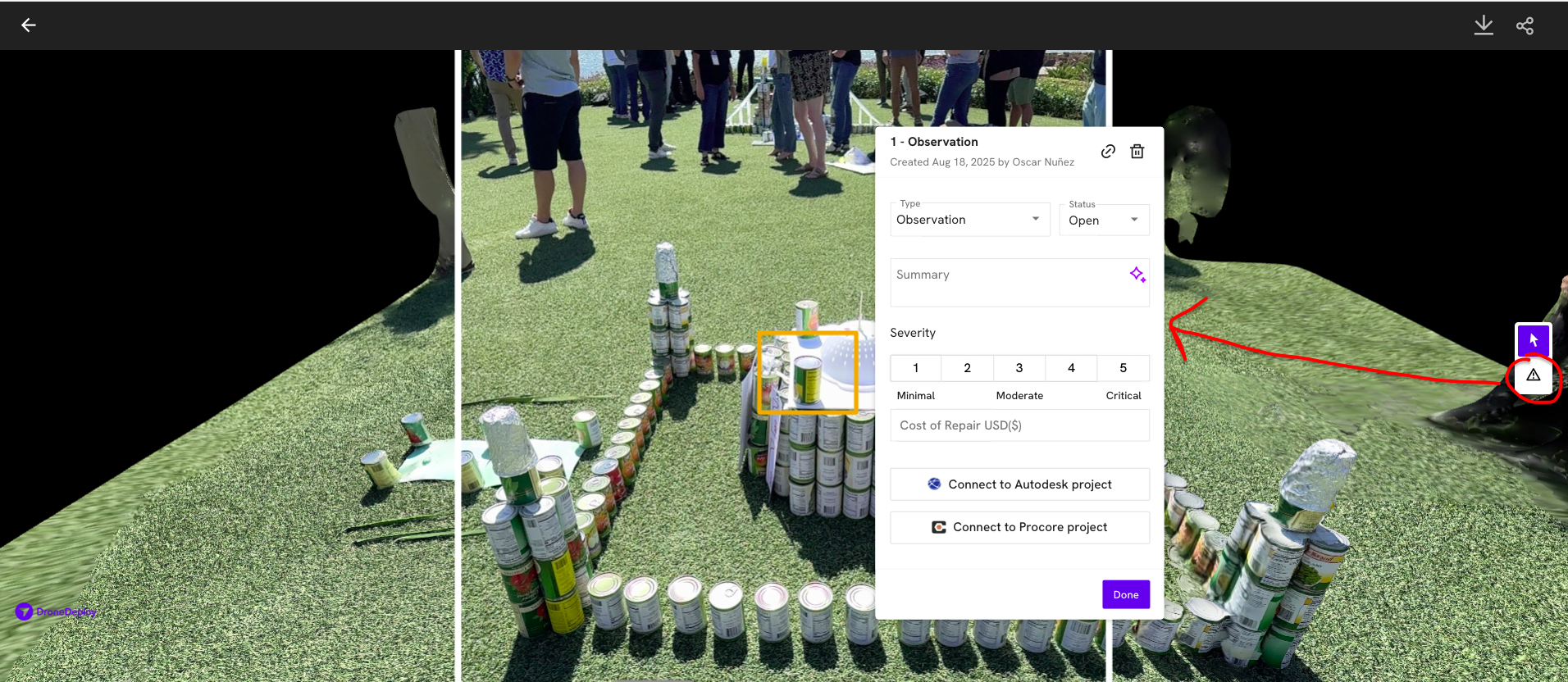 - Click the Field Note icon (triangle with exclamation mark) to activate field note creation. Click and drag the mouse to highlight an orange bounding box over the field note area. Fill out the field note information and click done.