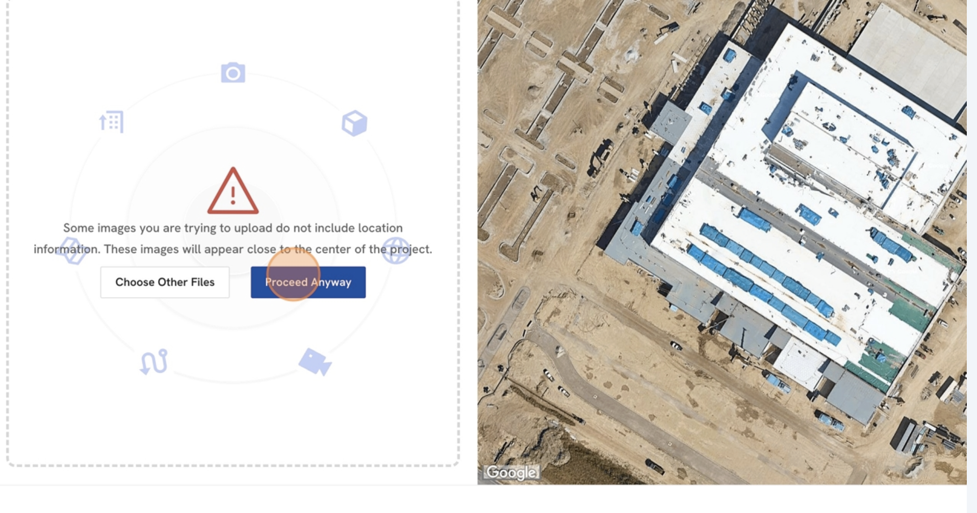 - The platform will notify you that it cannot geolocate the images from the C5 camera. Click Proceed Anyway to continue.