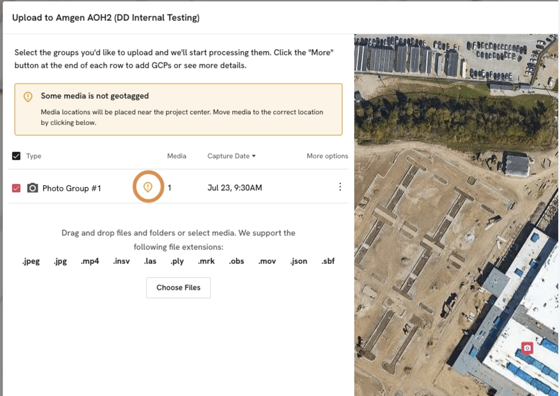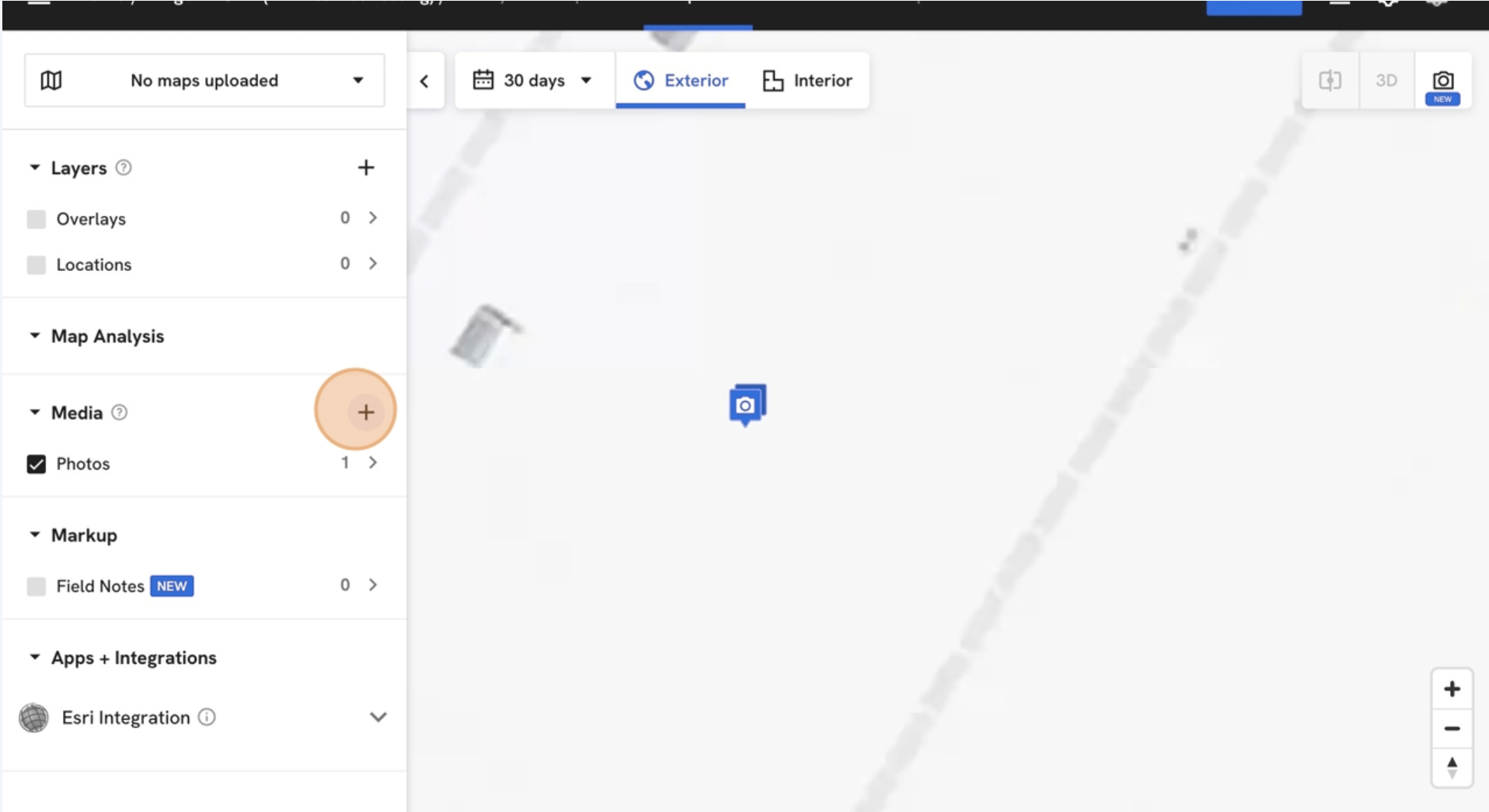 - Select the geo-marker icon to manually set the location of the photos. If you skip this step, the images will be placed in the center of the project.