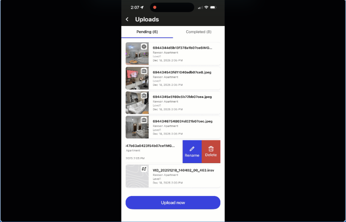 - Rename: Swipe left on a media card in the Pending Tab to rename the capture before it is uploaded.