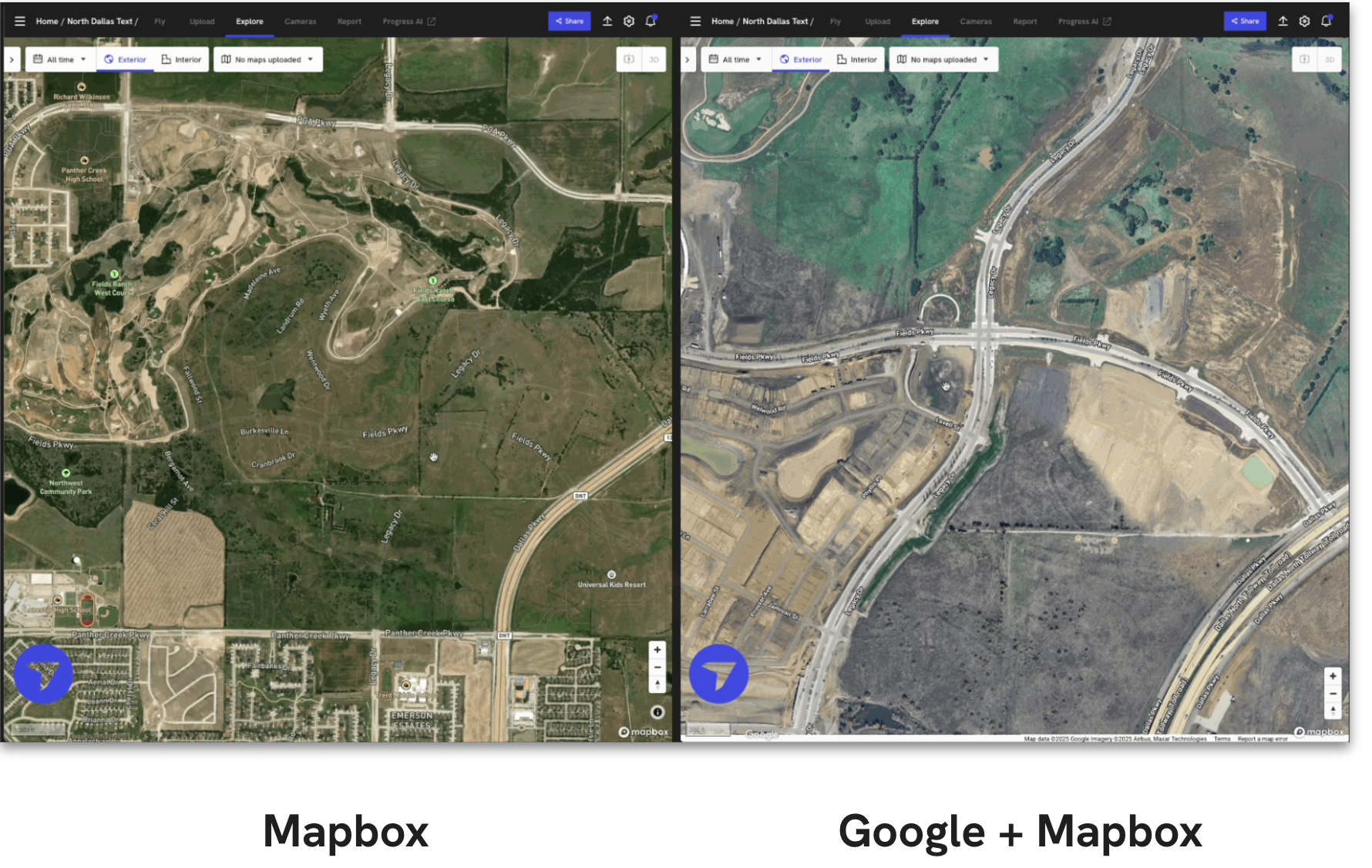 Google Maps imagery in Mapbox provides high-quality, up-to-date satellite imagery on the Explore page and the Dock flight page. This integration allows users to view detailed site conditions prior to creating a DroneDeploy map. The feature unifies mapping tiles across the flight, dock and explore workflows to ensure a consistent visual experience.