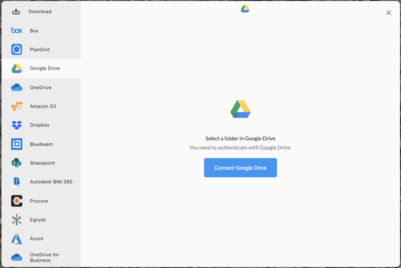 Supported File Types: The integration supports JPEG, PDF, GeoTIFF (.zip), DXF/SHP (.zip), Shapefile (.zip), OBJ (.zip), LAS (.zip), XYZ Point Cloud (.zip) and RCP (.zip). More details about file and size support.